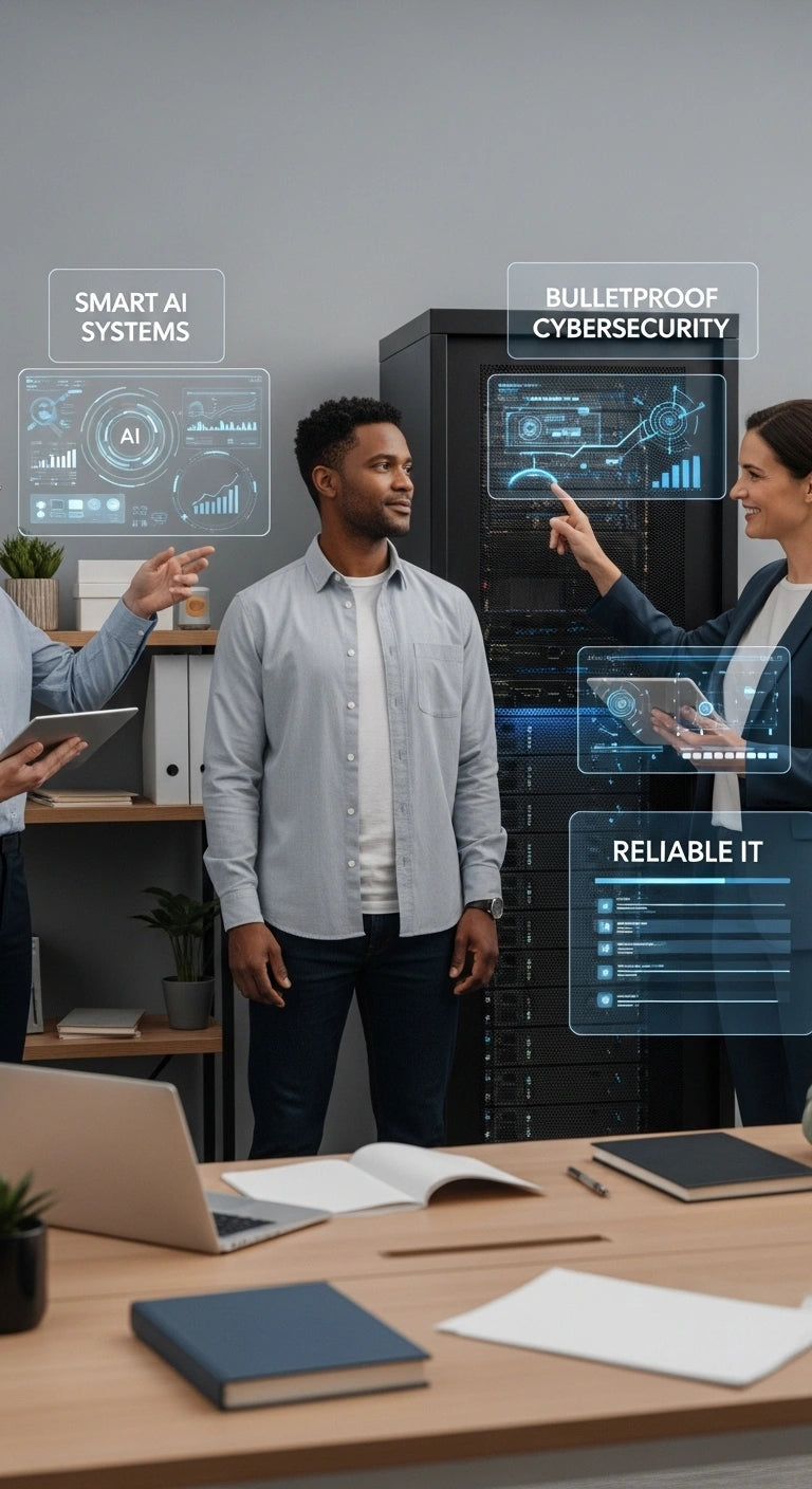 Our approach is different - we understand your real challenges first, then identify where AI can save time, reduce costs, and improve decision-making without disrupting what's working well. Our services include AI workflow assessments, custom implementation, and ongoing support, plus the cybersecurity and compliance that other consultants overlook.